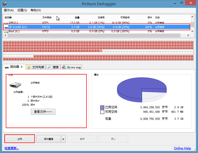 3、在打开的碎片整理程序工具窗口中,选择需要进行磁盘碎片扫描的硬盘,再点击左下角的“分析”按钮,如下图所示