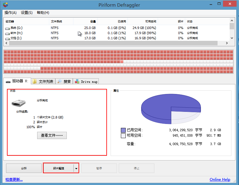 4、接下来工具将开始扫描所选择的磁盘,静待分析工作完成。如果存在磁盘碎片,我们可点击“磁盘整理”按钮开始进行碎片整理的操作,如果没有磁盘碎片。可尝试选择其他磁盘进行分析扫描,如下图所示