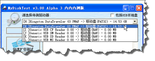 3、首先我们将要测试的U盘插入到电脑上,再打开MyDiskTest,如果你的电脑上插入了多个U盘,你还得从下拉列表中选择你要测试的U盘。