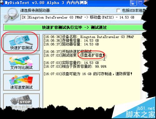 4、点击右侧的“快速扩容测试”,等几分钟后就会得到测试结果。很难过,我这个盘是扩容盘。