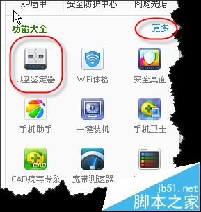 5、当然在360右下方的功能大全有“U盘鉴定器”功能,如果没有的话大家可以点击“更多”进行增加。