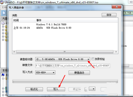 在写入硬盘映像的页面中,选择好你所要制作的U盘。如图示,“硬盘驱动器”里就是选择你要刻录的U盘,这里演示用的是一张数码相机的内存卡。写入方式默认是USB-HDD+,还有USB-HDD、USB-ZIP、USB-ZIP+,共四种供选择,这主要取决于你的主板支持的启动类型,可以在刻录前进CMOS看一下,注意有的主板需要插入U盘才会显示支持的类型。U盘可以在刻录前格式化,也可以通过底下的“格式化”按钮进行,当然直接点“写入”也可以,会自动格式化。