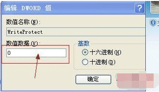建立Dword值命名为WriteProtect并令其值为0(双击WriteProtect即可弹出设置对话框。如图:
