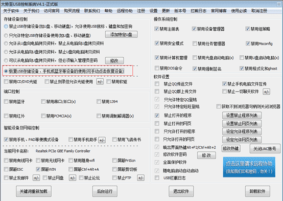 2、在“大势至USB端口管理软件”界面的左上角选择“恢复USB存储设备……”的使用,然后U盘写保护即可就会取消。如下图所示:
