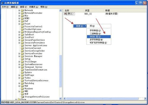 在StorageDevicePolicies新建的项中建立Dword值命名为WriteProtect;