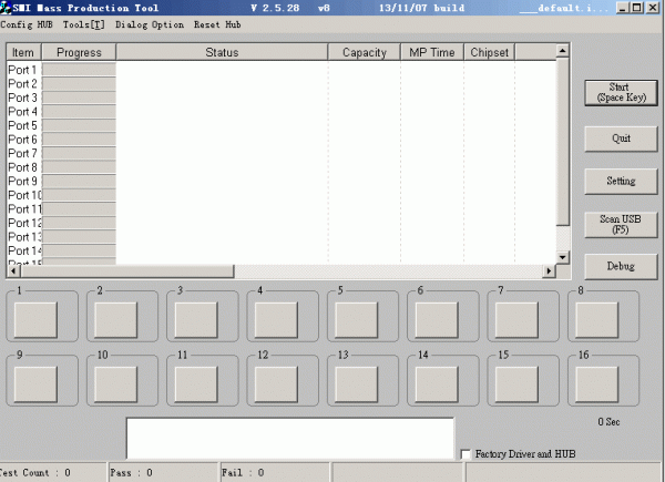 使用的量产软件(慧荣SM3267AB(SMI_USB3.0)主控U盘量产工具V2.5.31 v3(140102).rar)主程序是SM32xtest_V31-3.exe,有高格与低格设置,Setting设置按钮密码为320或两个空格,支持格式化U盘为FAT32、NTFS、exFAT分区格式,支持制作CDROM启动盘(需要打开Make Auto Run功能选项) 。内附Dyna Flash支持列表PDF档供大家参考。