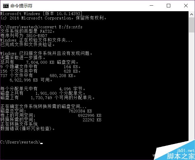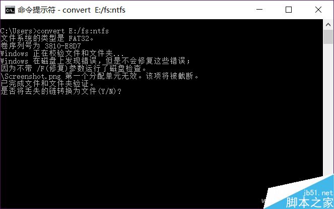 修复完毕,重新在提示符下输入转换命令进行转换,根据U盘空间大小以及存储文件的多少,进行转换时间也长短不一。