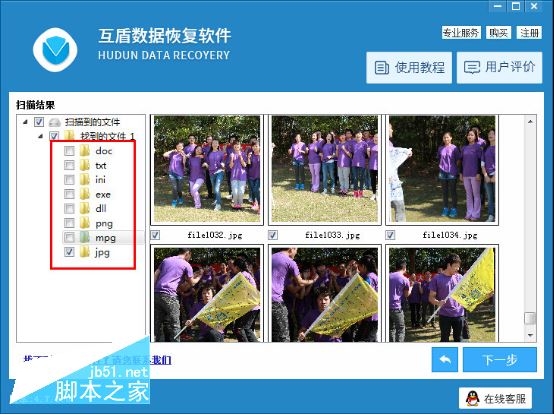 4) 软件扫描后,我们将会在软件左侧看见该U盘中所有数据文件列表,这里请选择相应的文件夹,如果是想要恢复图片请选择“jpg、png”等;如果想要恢复文档,可以选择“txt、doc”等。