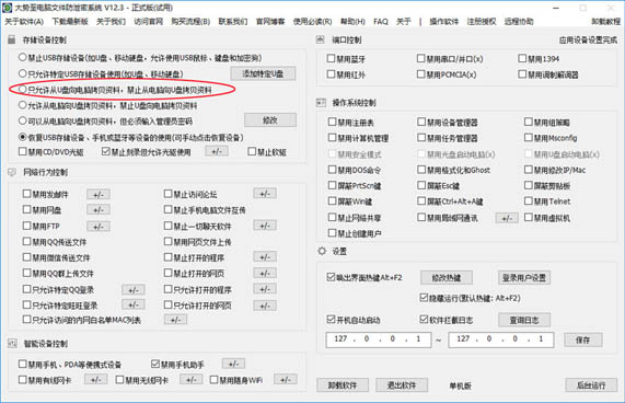 3、只允许从U盘向电脑拷贝文件,禁止电脑向U盘拷贝文件,或只允许电脑向U盘拷贝文件,禁止U盘向电脑拷贝文件。