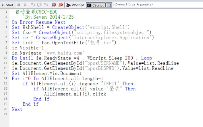 电脑浏览器记住密码功能好蛋疼~有时候不好用~~登录CMCC-EDU的时候老是要输入帐号。。看了看登录页面的网页源码~~撸起个Vbs脚本~读取配置文件,简单实现了自己登录CMCC-EDU,把帐号存在同级目录下就好。一行帐号,一行密码。
