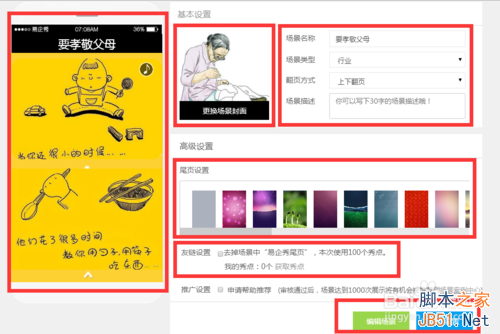 对所制作的H5进行“封面”“标题”“翻页方式”“描述”“页尾”等内容进行设置。如果不想要“页尾”,可以用秀点去掉。最后,点击“保存设置”。