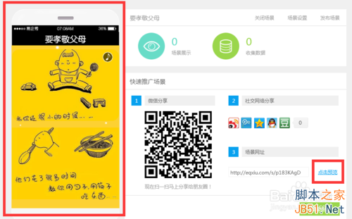 【手机查看场景】用手机二维码(微信、QQ、百度浏览器等带扫描的都可以)扫描二维码,即可获取场景内容。在手机浏览器里输入这个“场景网址”的连接,也可以获取场景内容。