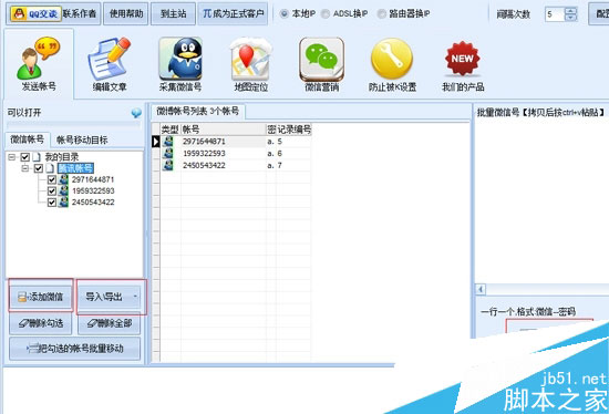 程序启动后,打开第一个界面。可以录入或导入微信、QQ号、手机号用来登录微信做群发: