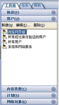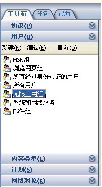 (1)现在我们建立第一个用户集,在防火墙策略右边的工具箱中,点击“用户”,然后点击“新建”