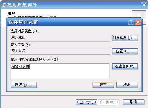 在“输入对象名称来选择”栏里面输入“浏览网页组”,然后点击“检查名称”。