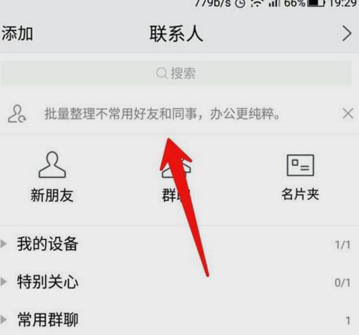 2、在好友名单中,点击图示位置中的“批量管理不常用好友”提示行。