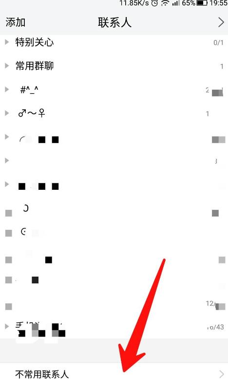5、隐藏成功之后,退出到好友列表中,查看最下面“不常用联系人”即可查看刚刚被隐藏的好友,点击其,在下方弹出的选项框中即可进行恢复好友等操作!