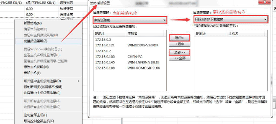 在主机列表点击右键,选择批量指派策略,在下拉菜单左边选择当前策略,右边选择将要指派的策略,然后点击“全部>>”或选中部分主机点击“选中>>”
