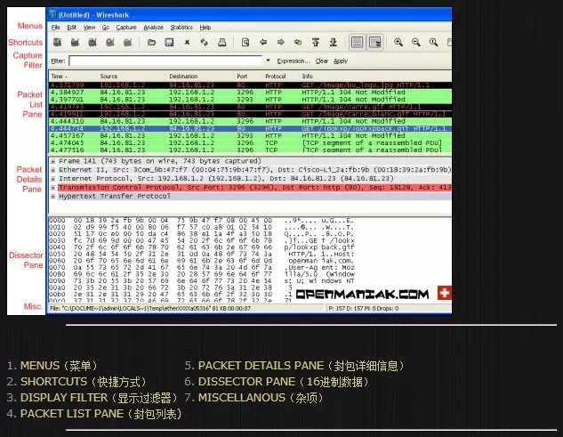 封包列表(Packet List Pane)的面板中显示:编号,时间戳,源地址,目标地址,协议,长度,以及封包信息。