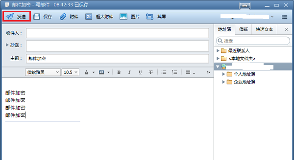 5、点击确认之后就对这封邮件进行加密了,输入邮件的内容,点击发送,如下图所示: