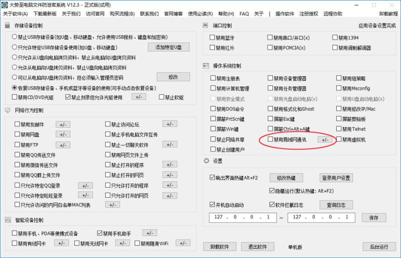 最终,我们找到了一款简单且好用的小软件,名字是大势至电脑文件防泄密系统(下载试用:http://www.grabsun.com/278_38.html),这款软件几乎不占用电脑资源,兼容性、稳定性都非常好,不会跟任何管理工具相冲突,安装在电脑中以后就无需再管了。大势至电脑文件防泄密系统支持所有主流的Windows操作系统,全部功能都在软件界面上,根据需要进行勾选,例如禁止飞鸽飞秋,我们只需勾选禁止“局域网通讯”即可,如图: