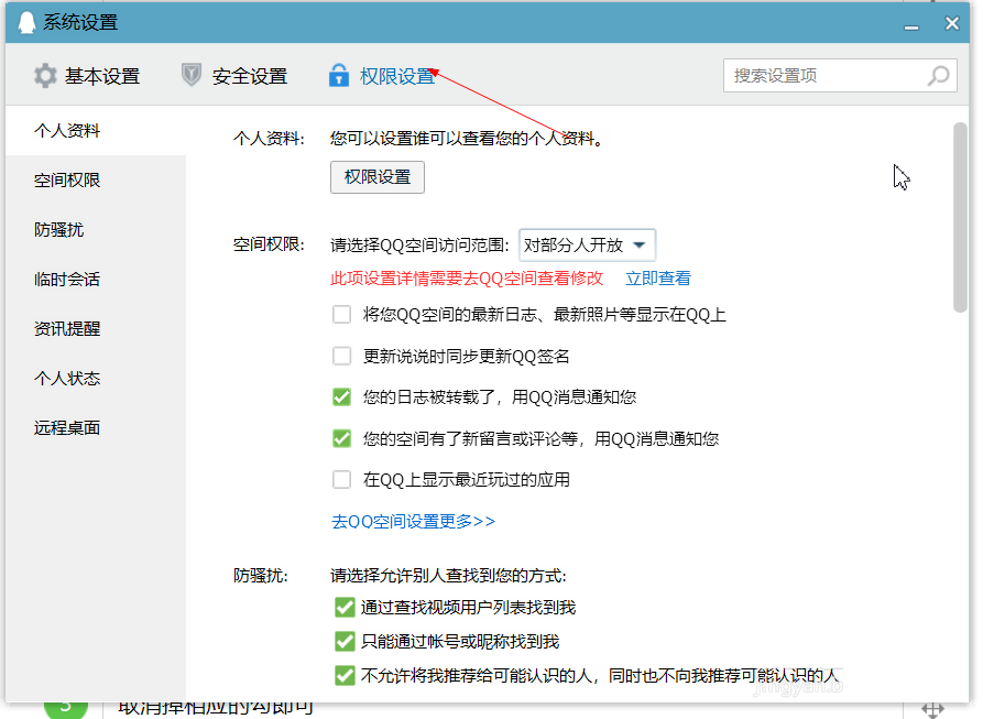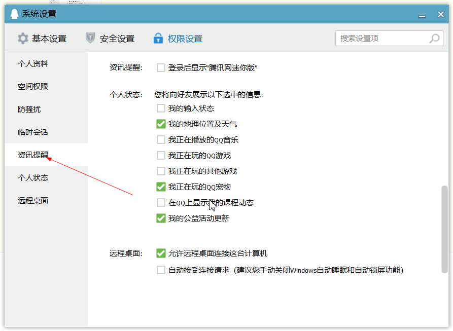 3、在“权限设置”选项卡。“临时会话”“资讯提醒“