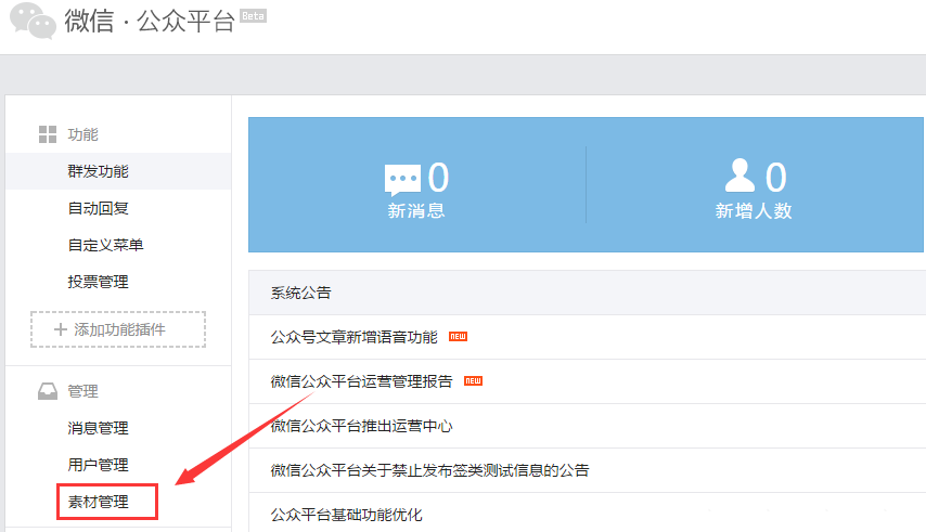 1、直入微信公众平台的后台,然后再点击素材。