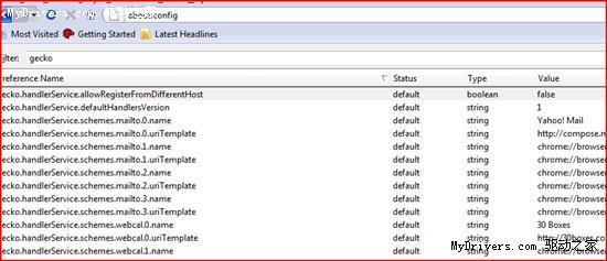 4.设定Yahoo或Gmail为默认邮件程序 “工具”—“选项”,打开“程序”搜索mailto,选择YahooMail即可。Gmail是不在默认的设置列表中的,您可以通过简单步骤自行添加:在Firefox地址栏输入about:config并回车,在“过滤器”一栏输入gecko选择第一个gecko.handlerServiceAllowRegisterFromDifferentHost并双击,改变其值False为True,然后在浏览器复制粘贴:javascript:window.navigator.registerProtocolHandler("mailto","https://mail.google.com/mail/?extsrc=mailto&url=%s","Gmail")回车。