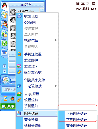 2)在QQ面板中直接用鼠标右键单击好友头象,在弹出的菜单中选择“聊天记录”“上传聊天记录” 如下图红框所示。