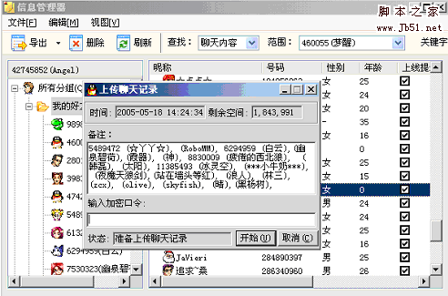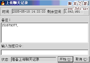 为了保证您的聊天记录在服务器上的安全存放,在选择"上传聊天记录"之后,系统将弹出密码输入的对话框要求您输入加密密码,请您牢记该密码,因为该密码如果丢失将不可通过其他方式取回,您将无法将上传的聊天记录下载。