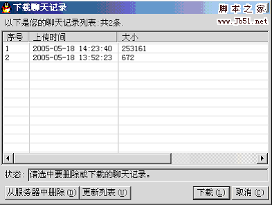 下载聊天记录在上面提到的三种方式中均可以进行操作,系统将弹出下载聊天记录的消息窗口,在消息窗口中记录了您每次上传聊天记录的时间与文件大小以及您现在所剩余的空间。您可以根据聊天记录序号选择下载, 也可以选择从服务器删除聊天记录。