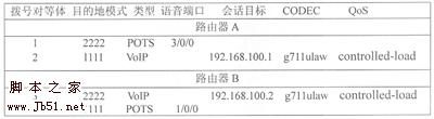 第2部分在清单4中描述,它提供语音连接的实质内容,语音端口简单地标识它们连接到的设备。拨号对等体1把电话号码分配给物理语音端口,拨号对等体2定义VoIP呼叫到站点B。在语音端口3/0/0上启动回声消除功能。IP优先级设置为5,设置资源预留协议RSVP为controlled-load,确保即使带宽发生拥塞与过载时,数据流也能得到优先处理。而且因为多余的带宽,语音活动检测被禁止了,并为拨号点配置了语音编码速率—64000bps。