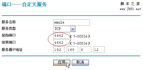 3)以eMule为例。当在局域网中使用eMule时,通常只能获得LowID,通过端口映射后即可获得HighID了。在”服务名称”中添加您为此服务的命名,此处我们将其命名为eMule,”服务类型”选择TCP(或者TCP/UDP):