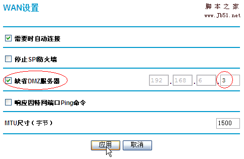 2.在WAN设置页面中的”缺省DMZ服务器”前打勾,然后将欲作为DMZ主机的电脑的IP地址填入,所以电脑的IP地址须是固定(手工设置)的,而不是自动获得:
