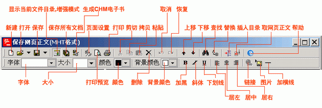 点击工具栏中的“显示当前文件目录,增强模式”图标,取网页内容或打开已保存的网页,点击“生成CHM电子书”。