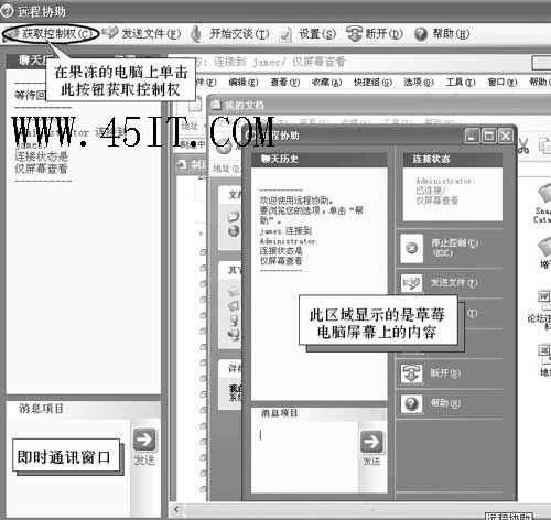 在如图4所示的窗口中,点击左上角的“获取控制权”按钮,将会在草莓的电脑上弹出一个共享计算机控制的对话框,草莓只要点击“是”按钮,果冻便会获得草莓电脑的控制权,成为“在线工程师”。现在,“在线工程师”果冻就可以像使用自己的电脑那样对草莓的电脑进行操作了。