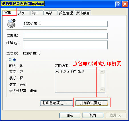 设置好后,这里我们默认的打印机是EPSON ME 1,所以打开EPSON ME 1属性,然后点共向后,选择共享打印机,共享名,默然的是EPSON ME 1,这里我们不需要改,请看图片