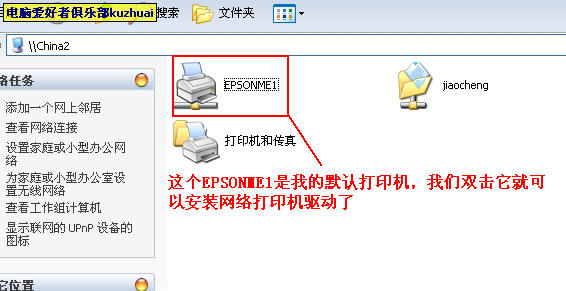 我们打开china2,就会看到打印机服务器里的默然的打印机,EPSONME1,(EPSONME1是我的默认打印机,大家可以根据自己的默认打印机去选择.)然后鼠标双击会提示你安装网络打印几驱动,按确定即可搜索和安装网络打印机驱动了,请看下面的图片