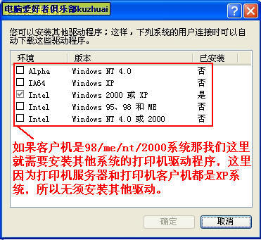 因为这里两台电脑,都是winxp系统,所以我们不需要装其他的驱动,默认的打印机服务器就是WINXP系统,而客户机也是XP系统,所以这里无需安装了.如果是打印机客户机是win98系统那就需要选择windows 98.98.ME这个安装驱动.好了.然后按确定,打印机服务器就算设置完成了