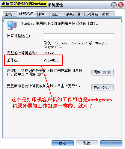 第一步,首先我们打开我的电脑--属性--计算机名--看看工作组是否和打印机服务器的工作是否一致.请看图片a打印机服务器的工作组和图片b打印机客户机的工作组.