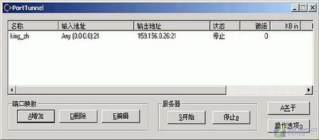 点击下部的“确定”按钮保存之后,服务器端的端口映射就完成了,这时会发现原先的主窗口中多出了一项记录,按下“开始”就可以激活PortTunnel的端口映射服务了。此时你可以通过其他网友通过ftp://129.156.0.21:21来访问你的FTP服务器,如果能够顺利登录就说明已经全部搞定了。