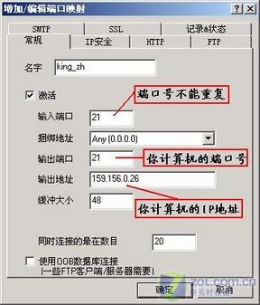 3、输出端口:这里填写的是你计算机中的FTP服务端口,通常采用默认的“21”,除非你另行指定了特殊的端口。