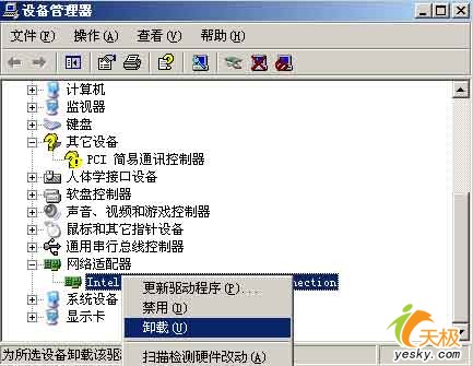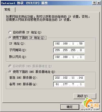 考虑到此次网络故障出现得比较急,而且故障范围相对也比较大,因此笔者首先想到的就是网络病毒,因为有的病毒一旦发作后,能导致与病毒发作计算机同处一个子网的所有计算机都出现无法上网故障或上网速度缓慢故障。有了这种担心后,笔者脑子想都没想,赶快找来了最新版本的杀毒软件,对出现网络故障的所有计算机进行了逐一查杀,经过了漫长的杀毒等待,笔者并没有找到任何一个病毒的影子,很显然这种发生规模相对较大的网络故障并不是由网络病毒造成的。在排除了病毒之后,笔者认为虽然这次故障发生的范围比较广泛,但并不是整个单位局域网中的所有计算机都发生了这样的故障,毕竟还有部分处室的计算机还是能够正常工作的,所以笔者认定该故障应该属于一种个别现象,而不应该属于局域网网络的普遍现象。依照这样的分析思路,笔者开始将目光转向了个别计算机身上;以往的网络故障排除经验告诉笔者,原本能够正常上网的计算机一旦突然不能上网或者上网速度缓慢的话,那很有可能是由三个方面的原因引起的,一个就是计算机自身的操作系统有问题,第二个就是网络连接线路的工作稳定性受到了突然性破坏,最后一个原因就是计算机所连的网络交换机出现了问题,现在笔者就从这三个方面对出现故障的计算机进行逐一排查。 从计算机操作系统方面来看,能够对网络连接造成影响的无非就是安装在计算机系统中的网卡驱动程序受到了突然破坏,或者计算机的上网参数受到了其他应用程序或人为因素的突然修改。依据这样的分析,笔者首先打开系统的设备管理器窗口,然后找到安装在本地计算机中的网卡设备,并用鼠标右键单击之,从其后出现的右键菜单中执行了“卸载”命令(如图1所示),这样就可以将安装在本地系统中的网卡驱动程序彻底从系统中删除干净了;接下来按常规方法将网卡的原装驱动程序重新安装了一遍,安装好网卡驱动后,笔者又打开本地系统的网上邻居窗口,并用鼠标右键单击其中的“本地连接”图标,从其后的右键菜单中执行“属性”命令,打开本地连接属性设置窗口,并单击该窗口中的“常规”标签,然后选中对应标签页面中的“Internet协议(TCP/IP)”选项,并单击一下“属性”按钮,打开如图2所示的属性设置界面;在该界面中,我们必须正确设置好IP地址以及网关地址,同时设置好DNS服务器的IP地址,设置好所有网络参数后,再次重新启动一下计算机系统,原以为这样的努力能够消除无法上网的故障,可事实告诉笔者这样的故障现象并不是由软件系统引起的。//本文来自脚本之家www.jb51.net 在排除了软件系统因素后,笔者又对出现故障计算机的网络连接线路进行了检查。为防止网络连接线缆的接头出现松动,笔者特地将网络线缆接头从网卡上拔了下来,然后用力重新插了一下,可是这样做好象一点效果也没有;那会不会是网络连接线缆中途被轧断,或出现了其他断裂现象呢?笔者放心不下,特地用能够正常上网的线缆换插到有故障的计算机中,但是网络故障依旧存在。那有没有可能是网卡自身有硬件故障呢,考虑到有硬件故障的网卡如果仍然接入到网络中的话,可能会向网络中不停地发送广播信息,会不会是大量的垃圾广播信息阻碍了网络的正常传输呢?带着这样的疑惑,笔者开始对网卡设备是否存在硬件故障进行了测试。大家知道,如果网卡硬件有问题的话,那么我们为网卡分配的IP地址,就不能被ping命令ping通;根据这样的标准,笔者先查到了某故障计算机的IP地址为“192.168.1.58”,然后依次单击本地计算机中的“开始”/“运行”命令,在其后出现的系统运行对话框中,输入字符串命令“ping 192.168.1.58 -t”,单击回车键后,笔者在其后弹出的图3结果界面中发现,本地IP地址可以被正常ping通,这表明网卡在硬件方面也不存在任何问题。