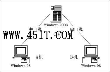 选择一台装有Windows 2003系统的计算机,确保它上面有串口和并口,再选择一台有并口的Windows 98计算机和一台有串口的Windows 98计算机,然后按图1所示的结构分别用并口线和串口线将三台计算机连接起来。