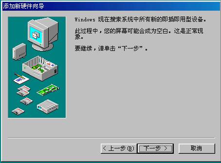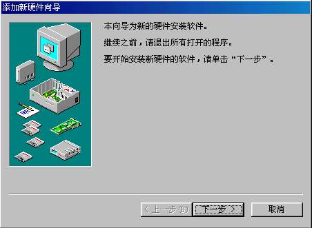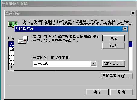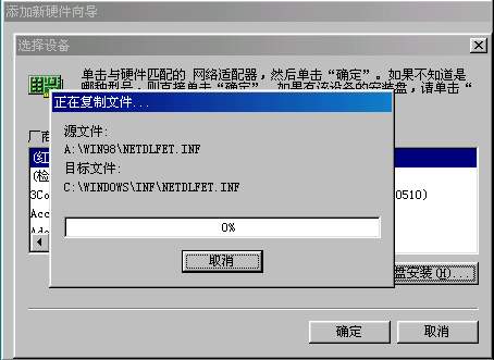 第一步:安装网卡驱动程序,进入控制面板,双击添加硬件(图501.jpg),按下一步(图502.jpg),下一步(图503.jpg),选“网络适配器”,下一步,找到网卡的驱动盘,点击“从磁盘安装”(图504.jpg),输入网卡动动的路径a:\win98(505.jpg),确定,计算机开始复制文件(506.jpg),复制文件以后,系统需要重新启动。