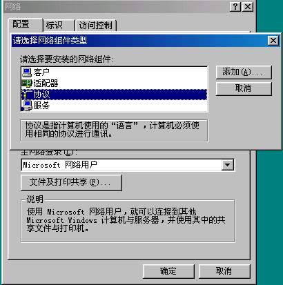 添加netbuei协议,计算机桌面-网上邻居-点击右键-属性,进入网络配置窗口,按添加(图511.jpg),选中协议,按一下添加按扭(图 512.jpg),在左边选microsoft,右边选netbuei协议,最后按确定(图513.jpg),在这时计算机会提示你插入 windows98安装盘,然后把所需文件复制到计算机系统里。netbuei协议安装完成后,还需添加添加ipx协议,它与netbuei协议添加过程类似,在此便不累述。安装完协议以后需要重启计算机。