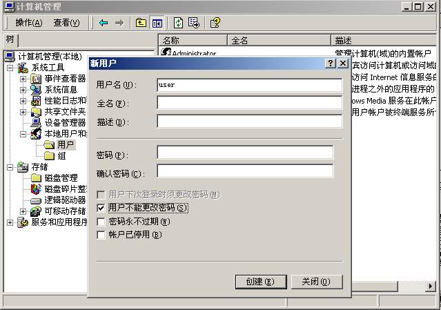 这两种系统互访前面七步与95-98-me一样,还有一点便是需在windows2000下,设置用户帐号,使之98能访问2000。2000下设置一个帐号(比如user)或者把guest帐号激活,在98里以user用户名登录,这样才能访问到2000里的数据。假如在2000下不设置用户帐号,则2000的机器能访问98,而98却不能访问2000。以笔者使用的windows 2000 server版为例,开始-程序-管理工具-计算机管理,选本地组和用户-右键-新用户(图519.jpg),在帐户里输入user,并把用户不能更改密码选中。
