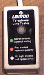 技术人员可以通过多种方法来检测电话线路问题,笔者在这里推荐一款方便的电话线测试器。请参加图G。该款测试器通过绿色的LED灯来显示线路正常,而红灯则表明线路接错。而不发光则表明线路断路。在一般的硬件商店都有这类工具,其性能大同小异,可以随用户心意挑选。
