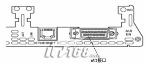 AUI接口是专门用于连接粗同轴电缆的,虽然目前这种网络在局域网中并不多见,但在一些大型企业网络中,仍可能有一些遗留下来的粗同轴电缆令牌网络设备,所以有些交换机也保留了少数AUI接口,以更大限度地满足用户需求。AUI接口是一个15针“D”形接口,类似于显示器接口。这种接口同样也在许多网络设备中见到,如路由器,甚至服务器中,如图4所示的就是路由器上的AUI接口示意图。