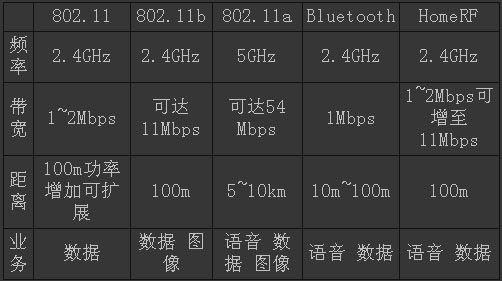无线接入技术区别于有线接入的特点之一是标准不统一,不同的标准有不同的应用。正因为此,使得无线接入技术出现了百家争鸣的局面。在众多的无线接入标准中,无线局域网标准更成为人们关注的焦点。附表中列出了几种最热门的无线局域网标准的性能对比。